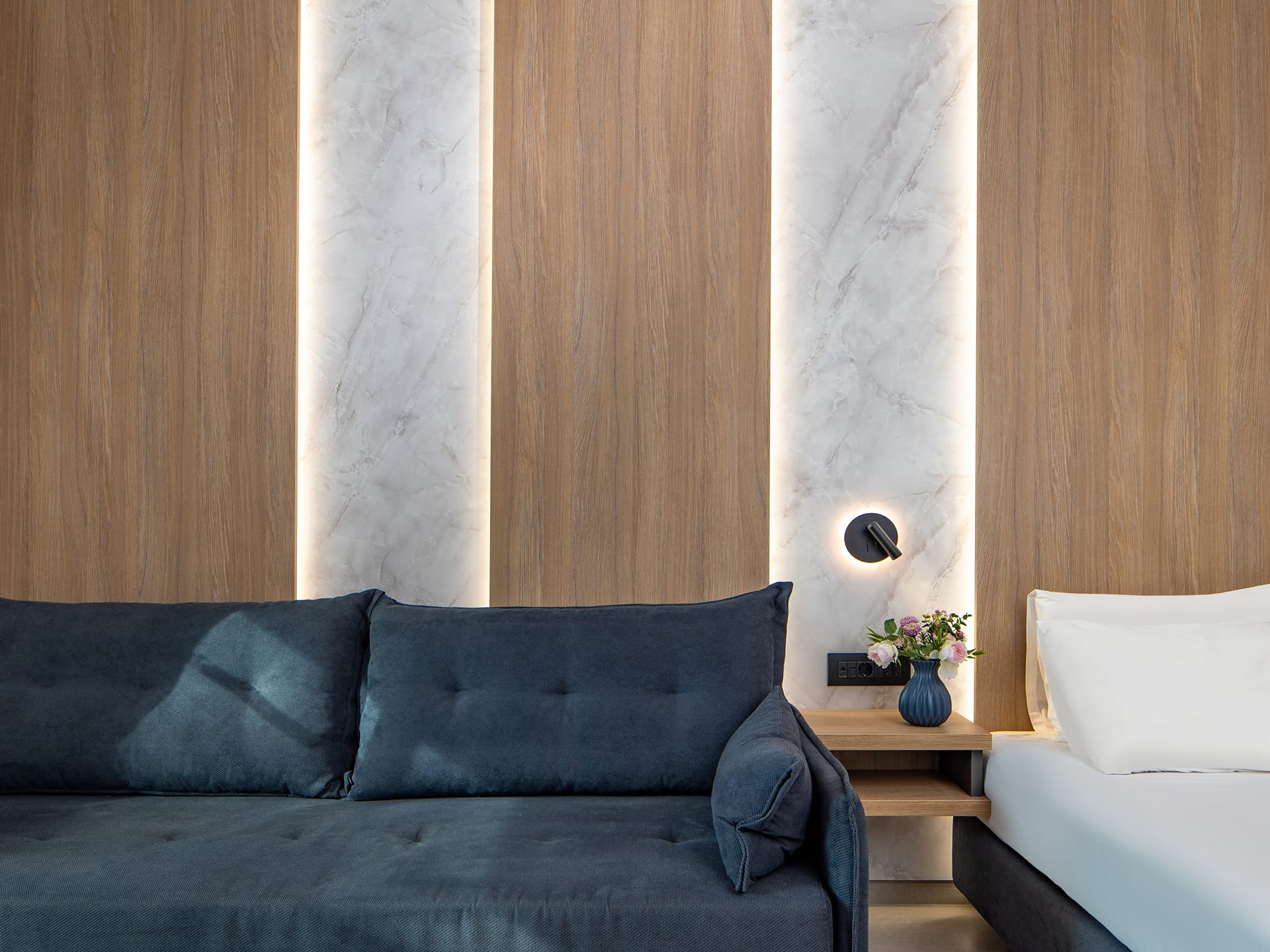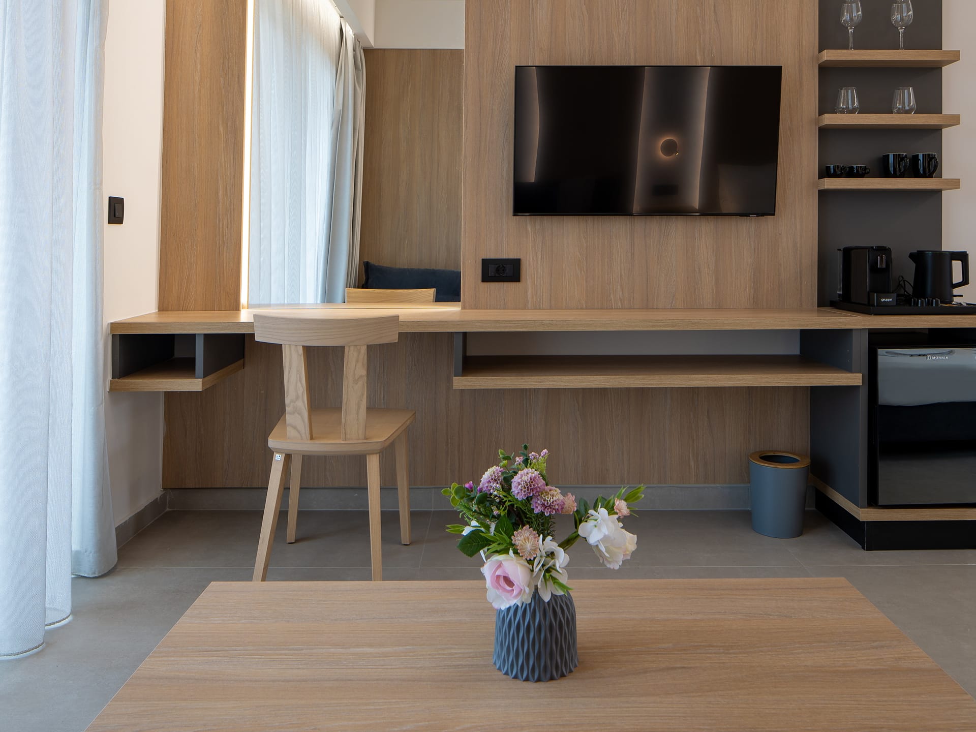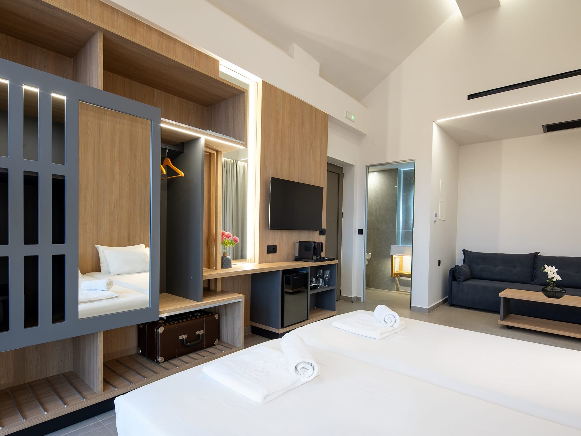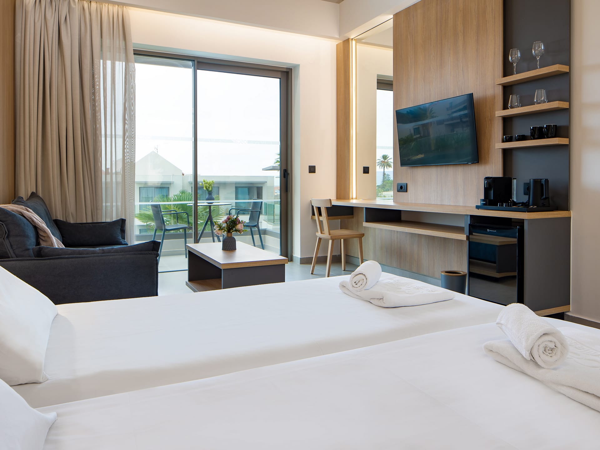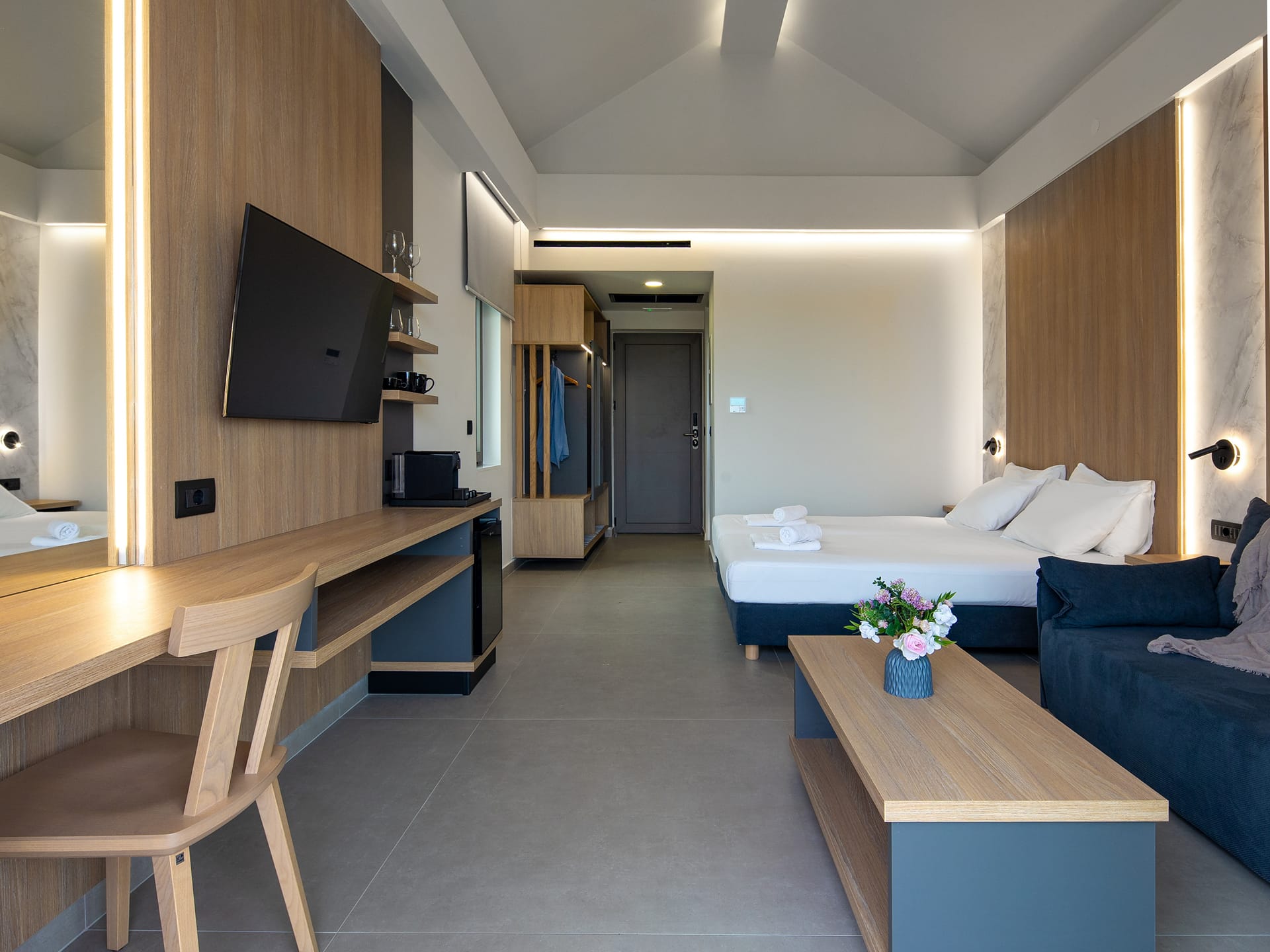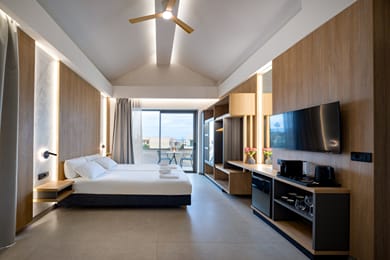 Designed for modern comfort, our Deluxe Double rooms in Agia Marina-Platanias offer a serene retreat for solo travellers or couples. Featuring a minimalist aesthetic with clean lines and contemporary furnishings, these stylish spaces are perfect for relaxation.